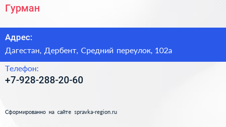 Гурман по адресу Дагестан, Дербент, Средний переулок, 102а в дальнейшем Организация, размещена в следующих категориях: