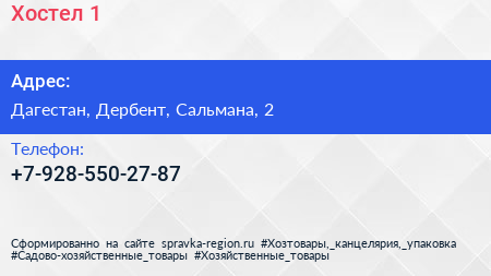 Хостел №1 по адресу Дагестан, Дербент, Сальмана, 2 в дальнейшем Организация, размещена в следующих категориях: