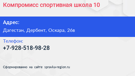 Компромисс, спортивная школа №10 по адресу Дагестан, Дербент, Оскара, 26в в дальнейшем Организация, размещена в следующих категориях: