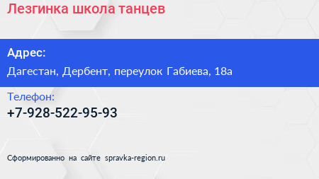 Лезгинка, школа танцев по адресу Дагестан, Дербент, переулок Габиева, 18а в дальнейшем Организация, размещена в следующих категориях: