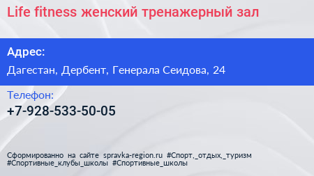 Life fitness, женский тренажерный зал по адресу Дагестан, Дербент, Генерала Сеидова, 24 в дальнейшем Организация, размещена в следующих категориях: