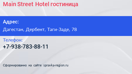 Main Street Hotel, гостиница по адресу Дагестан, Дербент, Таги-Заде, 78 в дальнейшем Организация, размещена в следующих категориях: