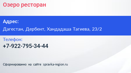 Озеро, ресторан по адресу Дагестан, Дербент, Хандадаша Тагиева, 23/2 в дальнейшем Организация, размещена в следующих категориях: