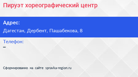 Пируэт, хореографический центр по адресу Дагестан, Дербент, Пашабекова, 8 в дальнейшем Организация, размещена в следующих категориях: