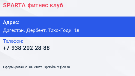 SPARTA, фитнес-клуб по адресу Дагестан, Дербент, Тахо-Годи, 1в в дальнейшем Организация, размещена в следующих категориях:
