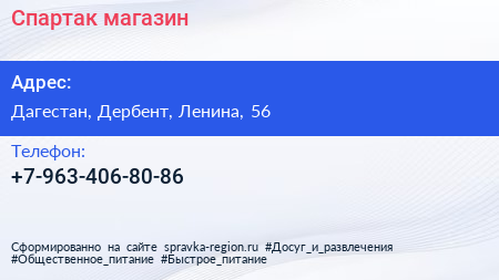 Спартак, магазин по адресу Дагестан, Дербент, Ленина, 56 в дальнейшем Организация, размещена в следующих категориях: