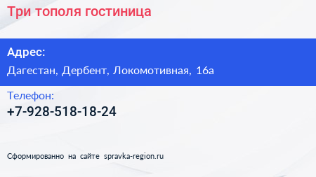 Три тополя, гостиница по адресу Дагестан, Дербент, Локомотивная, 16а в дальнейшем Организация, размещена в следующих категориях: