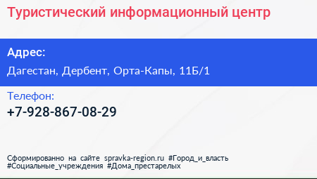 Туристический информационный центр по адресу Дагестан, Дербент, Орта-Капы, 11Б/1 в дальнейшем Организация, размещена в следующих категориях: