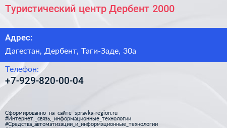 Туристический центр Дербент 2000 по адресу Дагестан, Дербент, Таги-Заде, 30а в дальнейшем Организация, размещена в следующих категориях: