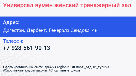 Универсал вумен, женский тренажерный зал по адресу Дагестан, Дербент, Генерала Сеидова, 4к в дальнейшем Организация, размещена в следующих категориях: