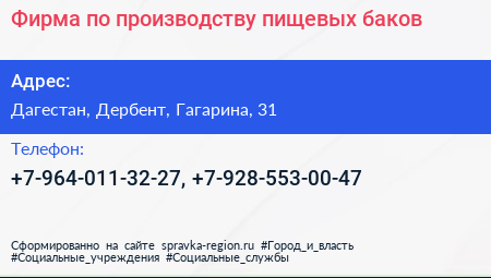 Фирма по производству пищевых баков по адресу Дагестан, Дербент, Гагарина, 31 в дальнейшем Организация, размещена в следующих категориях: