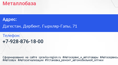 Металлобаза по адресу Дагестан, Дербент, Гырхляр-Гапы, 71 в дальнейшем Организация, размещена в следующих категориях:
