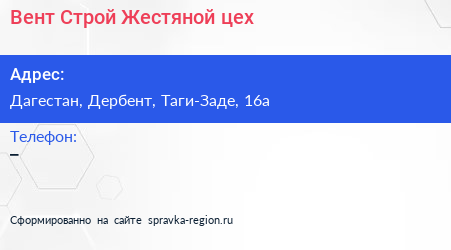Вент-Строй, Жестяной цех по адресу Дагестан, Дербент, Таги-Заде, 16а в дальнейшем Организация, размещена в следующих категориях: