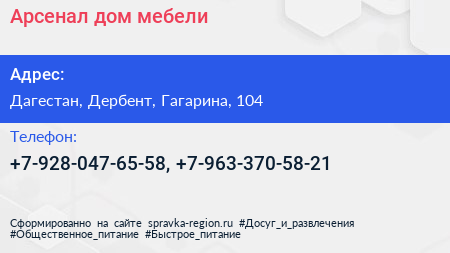 Арсенал, дом мебели по адресу Дагестан, Дербент, Гагарина, 104 в дальнейшем Организация, размещена в следующих категориях: