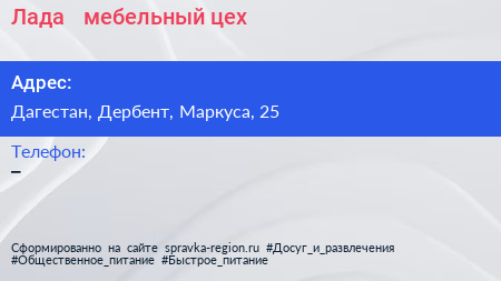 Лада +, мебельный цех по адресу Дагестан, Дербент, Маркуса, 25 в дальнейшем Организация, размещена в следующих категориях: