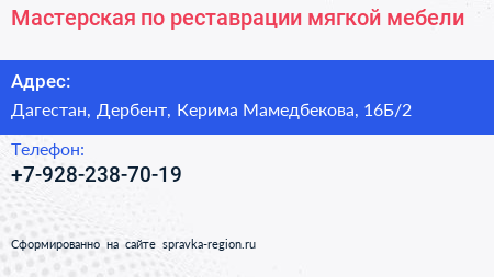 Мастерская по реставрации мягкой мебели по адресу Дагестан, Дербент, Керима Мамедбекова, 16Б/2 в дальнейшем Организация, размещена в следующих категориях: