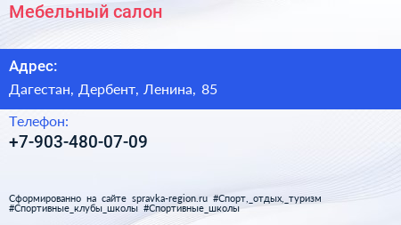 Мебельный салон по адресу Дагестан, Дербент, Ленина, 85 в дальнейшем Организация, размещена в следующих категориях: