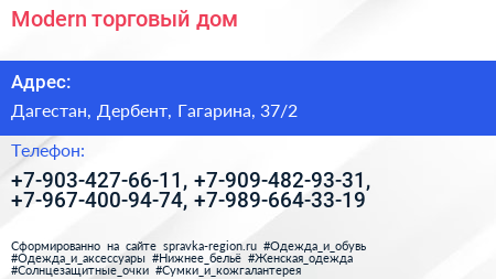 Modern, торговый дом по адресу Дагестан, Дербент, Гагарина, 37/2 в дальнейшем Организация, размещена в следующих категориях: