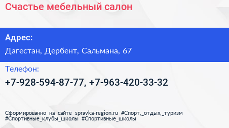 Счастье, мебельный салон по адресу Дагестан, Дербент, Сальмана, 67 в дальнейшем Организация, размещена в следующих категориях: