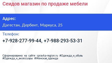 Сеидов, магазин по продаже мебели по адресу Дагестан, Дербент, Маркуса, 25 в дальнейшем Организация, размещена в следующих категориях: