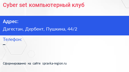 Cyber set, компьютерный клуб по адресу Дагестан, Дербент, Пушкина, 44/2 в дальнейшем Организация, размещена в следующих категориях:
