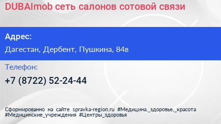 DUBAImob, сеть салонов сотовой связи по адресу Дагестан, Дербент, Пушкина, 84в в дальнейшем Организация, размещена в следующих категориях: