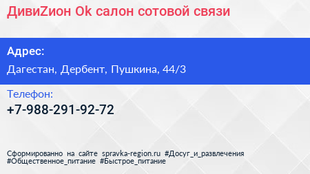 ДивиZион Оk, салон сотовой связи по адресу Дагестан, Дербент, Пушкина, 44/3 в дальнейшем Организация, размещена в следующих категориях: