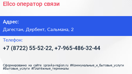 Ellco, оператор связи по адресу Дагестан, Дербент, Сальмана, 2 в дальнейшем Организация, размещена в следующих категориях: