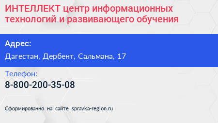 ИНТЕЛЛЕКТ, центр информационных технологий и развивающего обучения по адресу Дагестан, Дербент, Сальмана, 17 в дальнейшем Организация, размещена в следующих категориях: