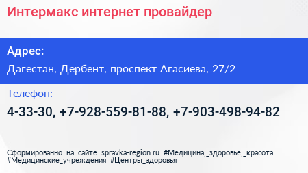 Интермакс, интернет-провайдер по адресу Дагестан, Дербент, проспект Агасиева, 27/2 в дальнейшем Организация, размещена в следующих категориях: