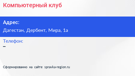 Компьютерный клуб по адресу Дагестан, Дербент, Мира, 1а в дальнейшем Организация, размещена в следующих категориях: