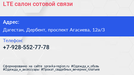 LTE, салон сотовой связи по адресу Дагестан, Дербент, проспект Агасиева, 12а/3 в дальнейшем Организация, размещена в следующих категориях:
