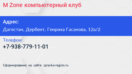 M Zone, компьютерный клуб по адресу Дагестан, Дербент, Генриха Гасанова, 12а/2 в дальнейшем Организация, размещена в следующих категориях: