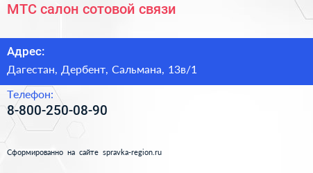 МТС, салон сотовой связи по адресу Дагестан, Дербент, Сальмана, 13в/1 в дальнейшем Организация, размещена в следующих категориях: