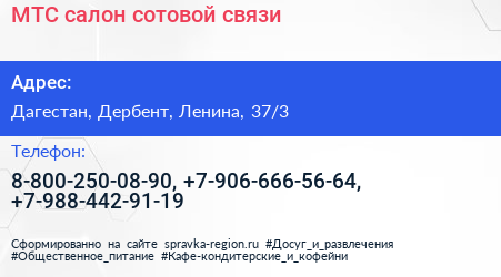 МТС, салон сотовой связи по адресу Дагестан, Дербент, Ленина, 37/3 в дальнейшем Организация, размещена в следующих категориях: