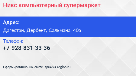 Никс, компьютерный супермаркет по адресу Дагестан, Дербент, Сальмана, 40а в дальнейшем Организация, размещена в следующих категориях: