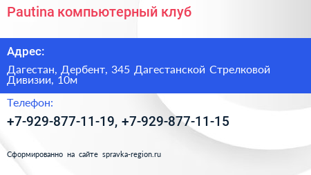 Pautina, компьютерный клуб по адресу Дагестан, Дербент, 345 Дагестанской Стрелковой Дивизии, 10м в дальнейшем Организация, размещена в следующих категориях: