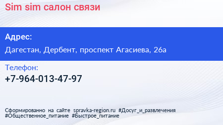 Sim sim, салон связи по адресу Дагестан, Дербент, проспект Агасиева, 26а в дальнейшем Организация, размещена в следующих категориях: