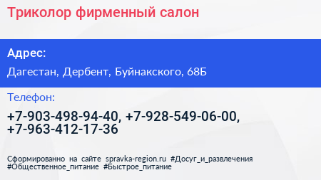 Триколор, фирменный салон по адресу Дагестан, Дербент, Буйнакского, 68Б в дальнейшем Организация, размещена в следующих категориях: