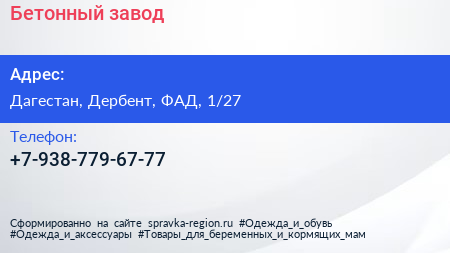 Бетонный завод по адресу Дагестан, Дербент, ФАД, 1/27 в дальнейшем Организация, размещена в следующих категориях: