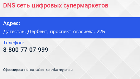 DNS, сеть цифровых супермаркетов по адресу Дагестан, Дербент, проспект Агасиева, 22Б в дальнейшем Организация, размещена в следующих категориях: