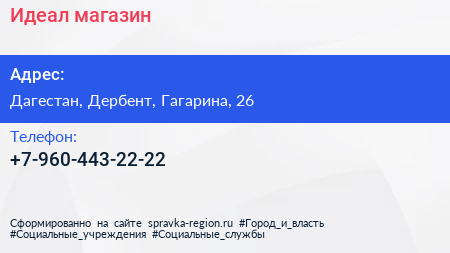 Идеал, магазин по адресу Дагестан, Дербент, Гагарина, 26 в дальнейшем Организация, размещена в следующих категориях: