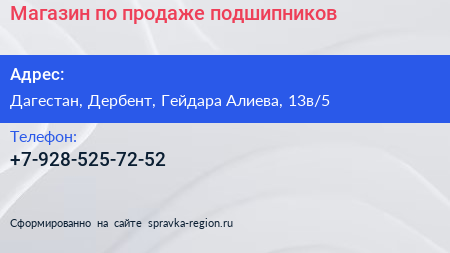 Магазин по продаже подшипников по адресу Дагестан, Дербент, Гейдара Алиева, 13в/5 в дальнейшем Организация, размещена в следующих категориях: