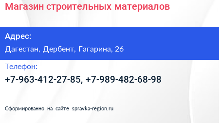 Магазин строительных материалов по адресу Дагестан, Дербент, Гагарина, 26 в дальнейшем Организация, размещена в следующих категориях: