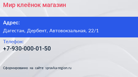 Мир клеёнок, магазин по адресу Дагестан, Дербент, Автовокзальная, 22/1 в дальнейшем Организация, размещена в следующих категориях:
