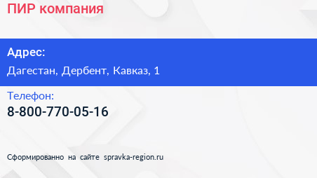 ПИР, компания по адресу Дагестан, Дербент, Кавказ, 1 в дальнейшем Организация, размещена в следующих категориях: