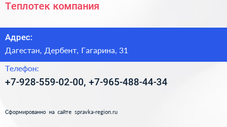 Теплотек, компания по адресу Дагестан, Дербент, Гагарина, 31 в дальнейшем Организация, размещена в следующих категориях: