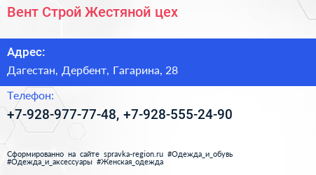 Вент-Строй, Жестяной цех по адресу Дагестан, Дербент, Гагарина, 28 в дальнейшем Организация, размещена в следующих категориях: