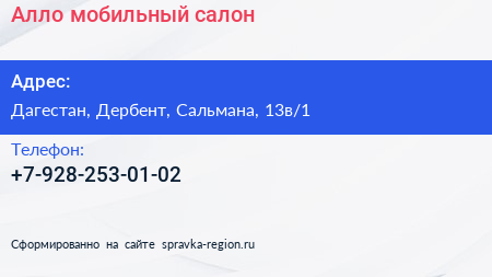 Алло, мобильный салон по адресу Дагестан, Дербент, Сальмана, 13в/1 в дальнейшем Организация, размещена в следующих категориях: