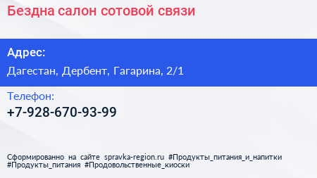 Бездна, салон сотовой связи по адресу Дагестан, Дербент, Гагарина, 2/1 в дальнейшем Организация, размещена в следующих категориях: